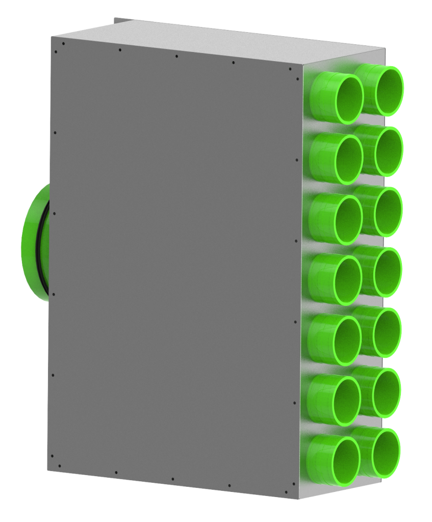 Rozdzielacz zapewnia wydajność do 420 m³/h, idealnie sprawdzając się w instalacjach wentylacji mechanicznej opartych na nowoczesnych systemach dystrybucji powietrza.