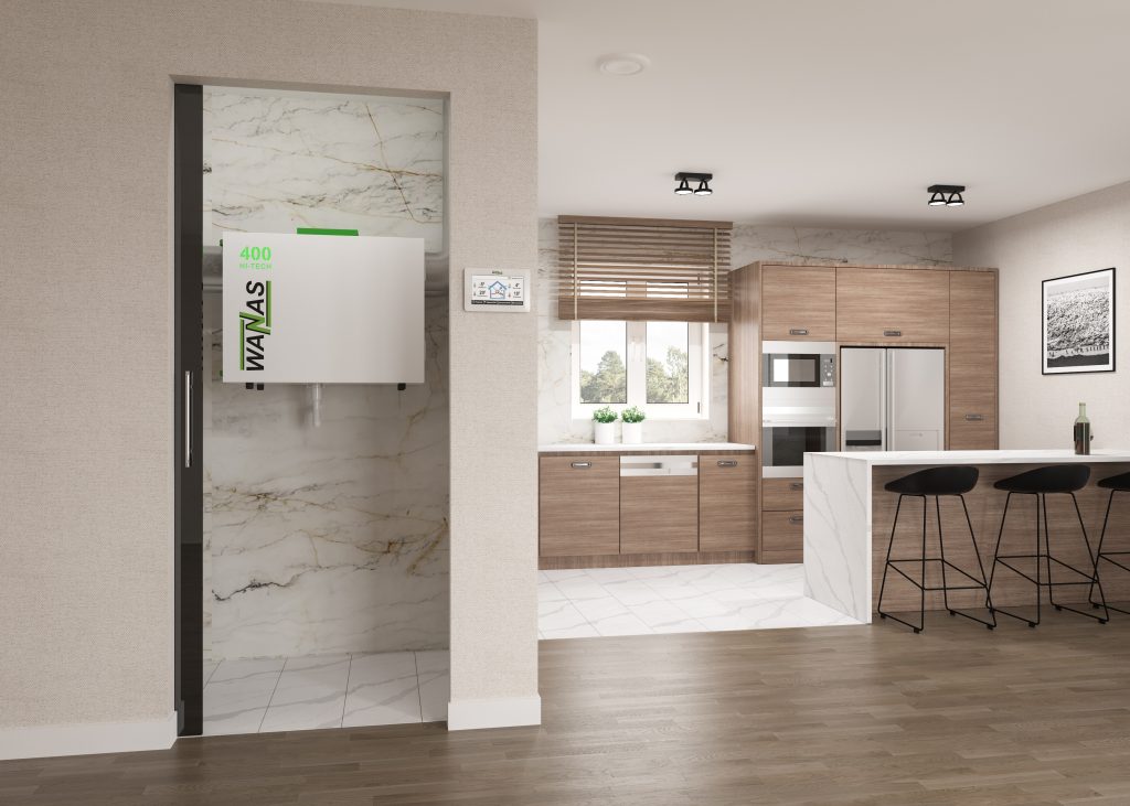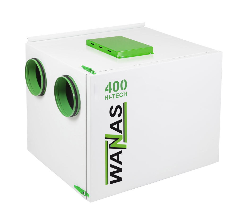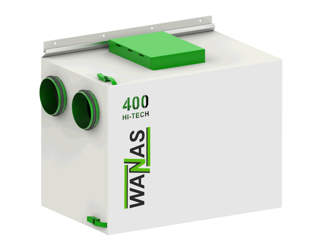 Rekuperator WANAS 400 H HI-TECH to kompaktowa centrala wentylacyjna z poziomym układem króćców, zaprojektowana do wentylacji domów jednorodzinnych, biur obiektów usługowych i handlowych . Charakteryzuje się bardzo niskim zużyciem energii, cichą pracą, wysoką sprawnością cieplną oraz łatwą obsługą. Solidna, niepalna konstrukcja oraz aluminiowy krzyżowo-przeciwprądowy wymiennik ciepła zapewniają trwałość i wysoką efektywność. Rekuperator przeznaczony jest do wentylacji pomieszczeń o powierzchni do 180 m². Standardowo wyposażony w dotykowy sterownik oraz nagrzewnicę wstępną. Standardowo wyposażony w nagrzewnicę wstępną wraz z modułem internetowym Wi-Fi.
