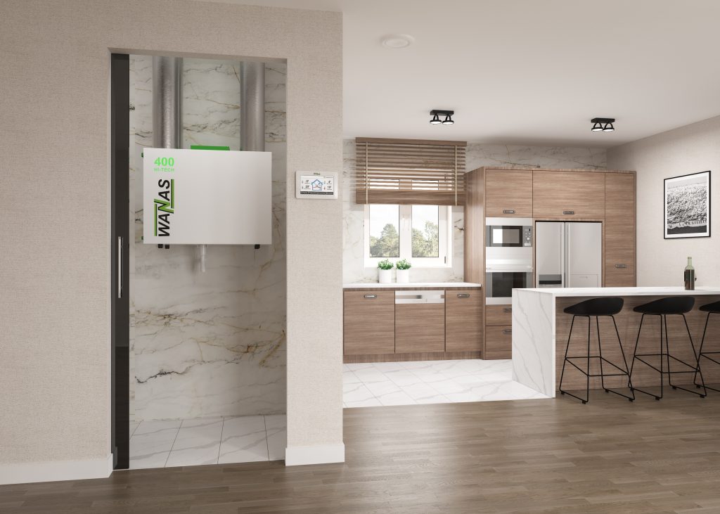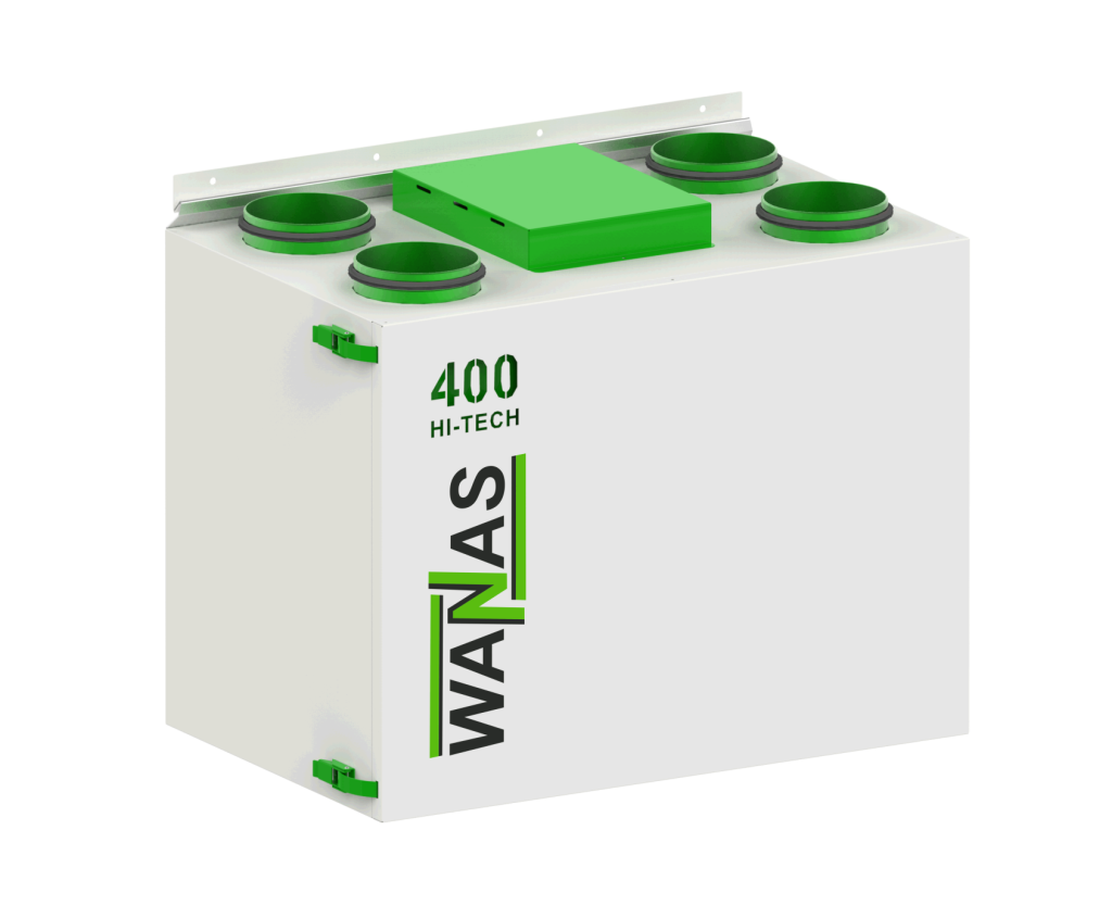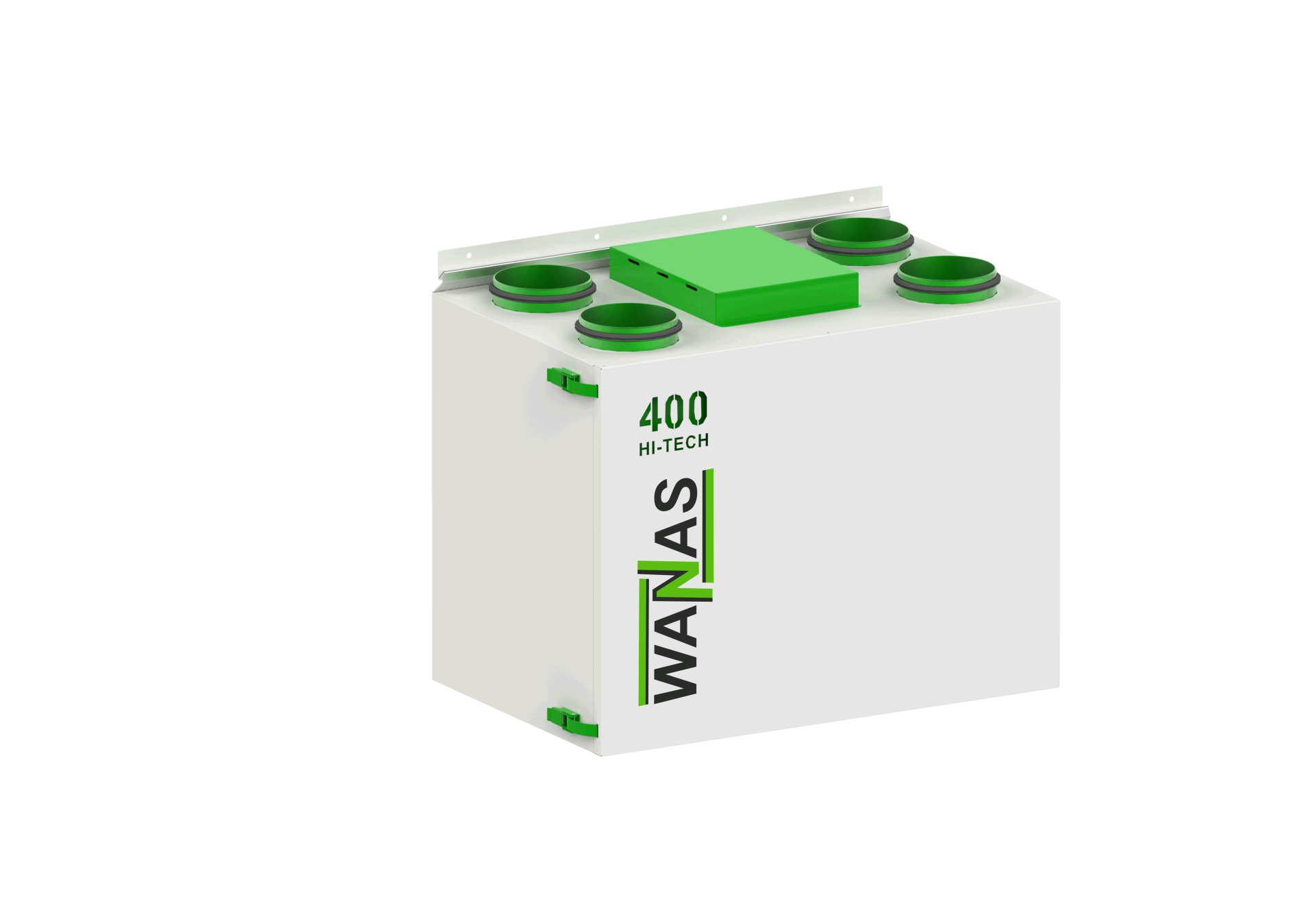 Rekuperator WANAS 400 V HI-TECH to kompaktowa centrala wentylacyjna z pionowym układem króćców, zaprojektowana do wentylacji domów jednorodzinnych, biur obiektów usługowych i handlowych . Charakteryzuje się bardzo niskim zużyciem energii, cichą pracą, wysoką sprawnością cieplną oraz łatwą obsługą. Solidna, niepalna konstrukcja oraz entalpiczny wymiennik ciepła zapewniają trwałość i wysoką efektywność. Rekuperator przeznaczony jest do wentylacji pomieszczeń o powierzchni do 180 m². Standardowo wyposażony w dotykowy sterownik wraz z modułem internetowym Wi-Fi.