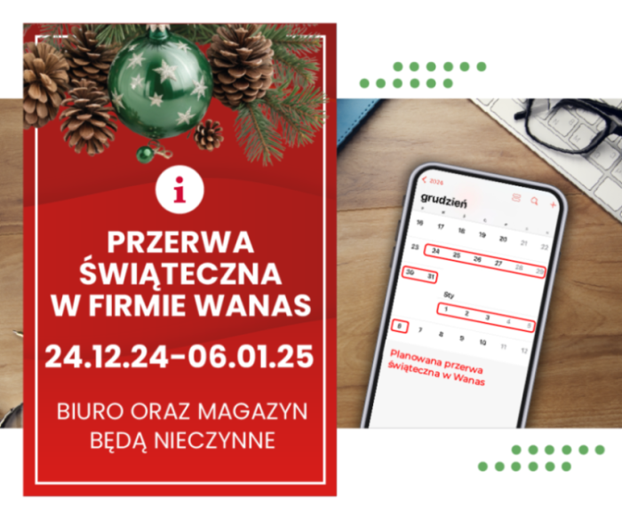 Informujemy, że w związku z nadchodzącymi świętami oraz coroczną inwentaryzacją firma WANAS będzie nieczynna w okresie od 24 grudnia 2024 roku do 6 stycznia 2025 roku.